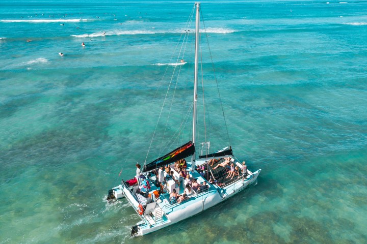 Step aboard Mana Kai, our iconic 32′ rainbow sailboat, for a 90-minute Sunset Sail along the stunning Waikiki coastline.